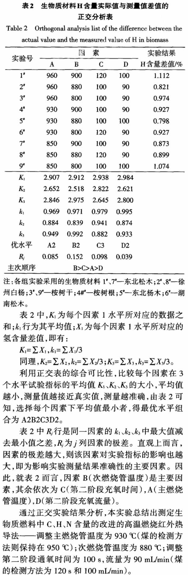 2實驗結果與討論 2.1高溫燃燒紅外熱導法的正交實驗條件分析依據正交實驗方案,用高溫燃燒紅外熱導法對不同生物質材料的H含量進行測定,獲得不同實驗工況下H含量的測定值與真實值的差值,如表2所示。
