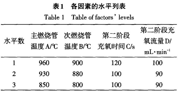 1.1.3紅外池和熱導池 紅外池:混氣罐中流出的混合均勻的燃燒產物分出一部分流人紅外池。生物質中的H以H2O的形式被H2O紅外池測定,C以CO2的形式被CO2紅外池測定。 熱導池:生物質中氮經過還原全部轉化為N2,還原爐流出的氣體成分為He、N2、H2O、CO2,經過凈化管去除H2O、CO2,進入熱導池的氣體為載氣He和生物質N轉化來的N2。熱導池對部分N進行定量測定。 1.2實驗設計 實驗選取東北松木、徐州白楊、桉樹干、桉樹根、東北楊木、湖南松木6種具有代表性的木質生物質,每次稱取0.1g進行實驗。影響高溫燃燒紅外熱導法測定準確的實驗因素主要有主燃燒管溫度、次燃燒管溫度、第二階段充氧時問和第二階段充氧流量,根據煤的高溫燃燒熱導法調整4因素在不同水平,如表1所示,控制主燃燒管溫度960、930、850℃;次燃燒管溫度900、880、800℃;第二階段充氧時間120、100、100s;第二階段充氧流量100、90、90mL/min。