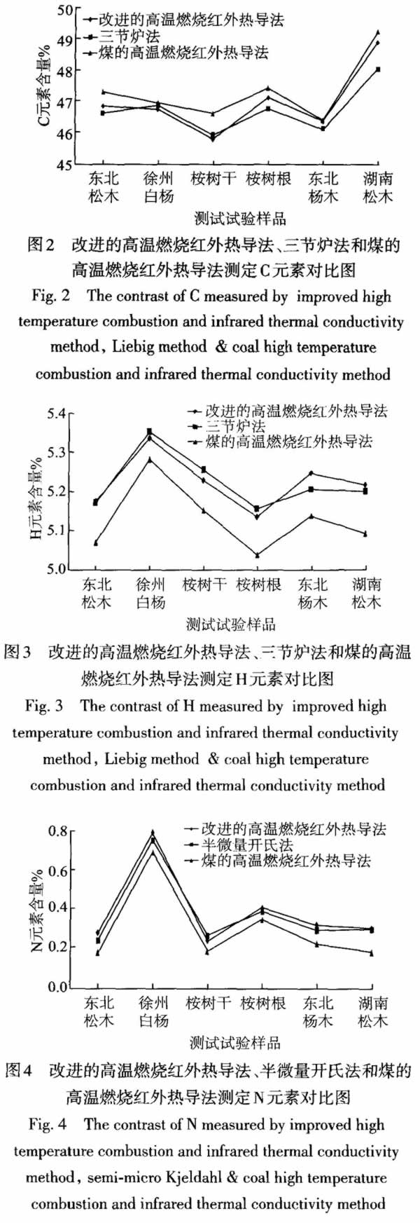 2.2改進的高溫燃燒紅外熱導法與測定條件優(yōu)化的三節(jié)爐和半微量開氏法對比分析 用改進的高溫燃燒紅外熱導法、測定條件優(yōu)化的三節(jié)爐和半微量開氏法、煤的高溫燃燒熱導法測定6種生物質材料(東北松木、徐州白楊、桉樹干、桉樹根、東北楊木、湖南松木)的C、H、N含量,如圖2圖4所示。