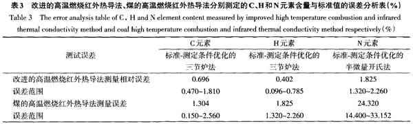 由圖2~圖4可知,以測定條件優(yōu)化的三節(jié)爐法測定的C、H元素的含量和測定條件優(yōu)化的半微量開氏法測定的N元素的含量為標準值,改進的高溫燃燒紅外熱導法測定值更接近標準值,改進的高溫燃燒紅外熱導法元素測定曲線和元素測定標準曲線幾乎重疊在一起,誤差帶小,相比煤的高溫燃燒紅外熱導法,改進的高溫燃燒紅外熱導法測定更準確;對6種不同的生物質測定,元素含量曲線從左到右的趨勢基本一致,說明改進的高溫燃燒紅外熱導法測定穩(wěn)定,測試生物質的種類范圍廣,應用前景廣闊。煤的高溫燃燒紅外熱導法元素測定曲線偏離元素測定標準曲線,誤差帶大,煤和生物質燃料雖然均為固體燃料,但其組分和結構存在一定差異,因此煤的高溫燃燒紅外熱導法并不適合測定生物質燃料,需對其試驗條件進行調整。 由表3可知,改進的高溫燃燒紅外熱導法對生物質燃料中的C、H、N元素含量測定,與測定條件優(yōu)化的半微量開氏法和三節(jié)爐法的標準結果對比,誤差范圍明顯減少。由此可知,改進的高溫燃燒紅外熱導法測定結果與標準結果相對誤差小,接近真實值,同時誤差波動范圍較小,測量結果更為穩(wěn)定可靠,要比煤的高溫燃燒紅外熱導監(jiān)測法的準確性高很多。