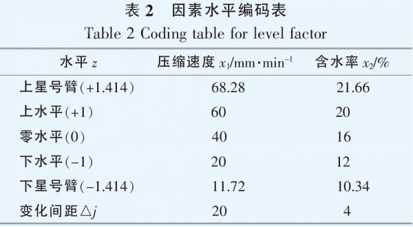 由表1可以看出,雖然同一種秸稈原料在不同壓縮成型條件下的比能耗有所差異,但都存在相同的變化規(guī)律,即當(dāng)原料含水率一定時(shí),隨著壓縮速度的增加,比能耗逐漸減??;當(dāng)壓縮速度一定時(shí),隨著含水率的增加,比能耗也相應(yīng)減小。不同秸稈原料的比能耗差異較大,其中稻草比能耗變化范圍最大,玉米芯次之,小麥秸稈、玉米秸稈和棉花秸稈的比能耗比較接近且較小,說(shuō)明當(dāng)冷態(tài)壓縮成型的工藝參數(shù)(如物料含水率和壓縮速度)在一定范圍變化時(shí),稻草和玉米芯的適應(yīng)性較差,壓縮成型效果不佳。 2.3比能耗回歸模型 從5種秸稈顆粒冷態(tài)壓縮成型試驗(yàn)結(jié)果可知,壓縮速度和物料含水率對(duì)比能耗的影響較大。為了進(jìn)一步研究壓縮速度和含水率對(duì)比能耗的影響程度,現(xiàn)以小麥秸稈為例,采用二次回歸通用旋轉(zhuǎn)組合設(shè)計(jì),建立小麥秸稈的比能耗二次回歸模型。 2.3.1試驗(yàn)方法 試驗(yàn)設(shè)計(jì)的因素水平編碼見(jiàn)表2。