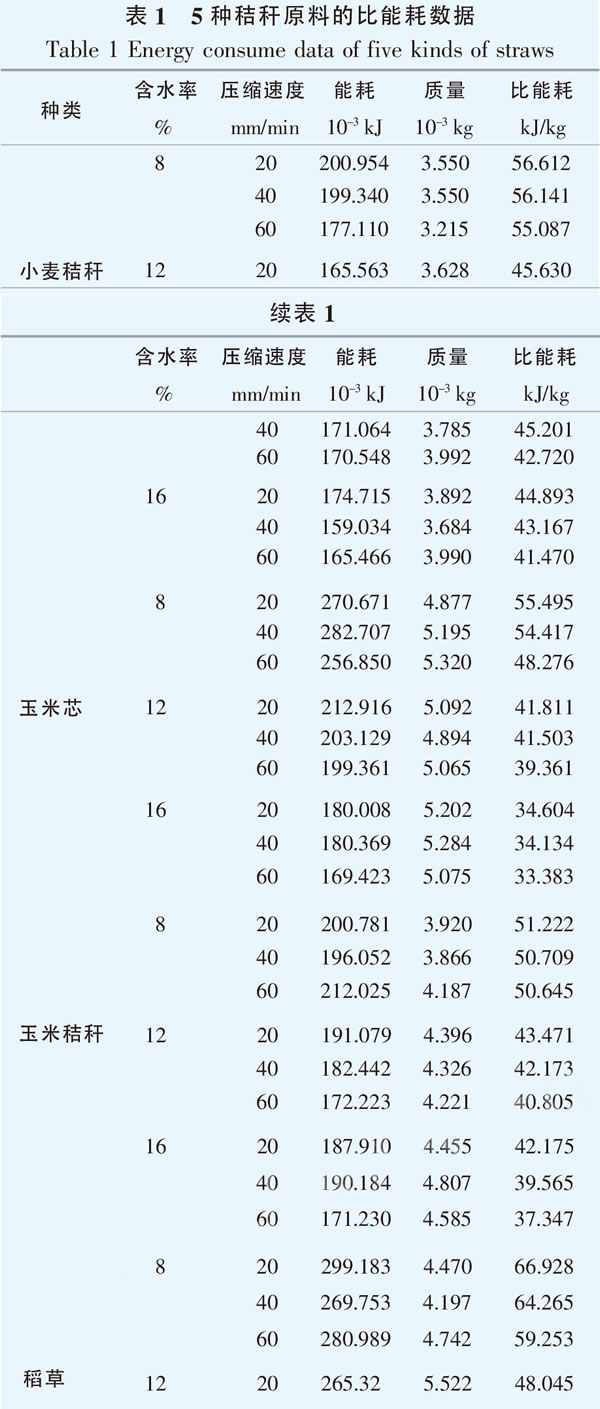 比能耗的具體計(jì)算步驟:提取不同壓縮成型條件下的試驗(yàn)數(shù)據(jù),按照不同壓縮成型區(qū)間分別進(jìn)行回歸分析,得出每個(gè)區(qū)間的壓強(qiáng)回歸方程,代入式(1)中,采用Matlab軟件計(jì)算出能耗數(shù)值,然后通過(guò)式(2)即可得出比能耗。5種秸稈原料在不同壓縮成型條件下的比能耗數(shù)據(jù)見(jiàn)表1。