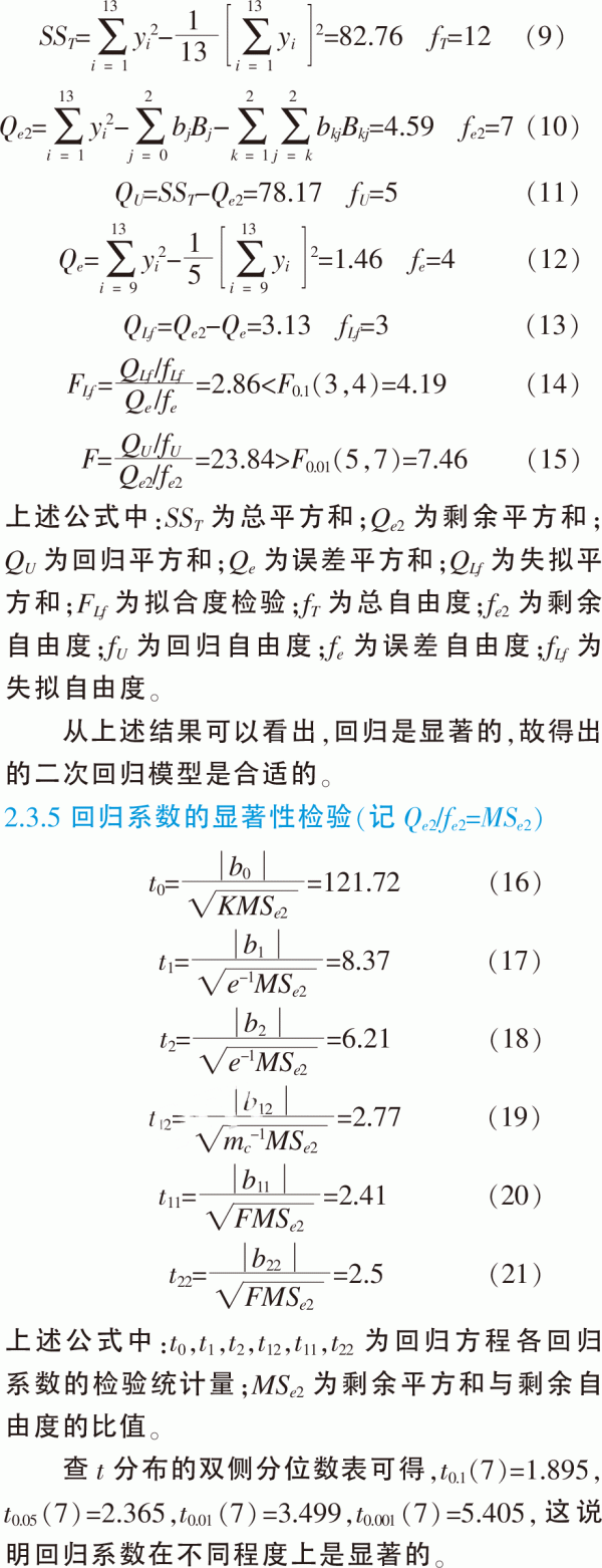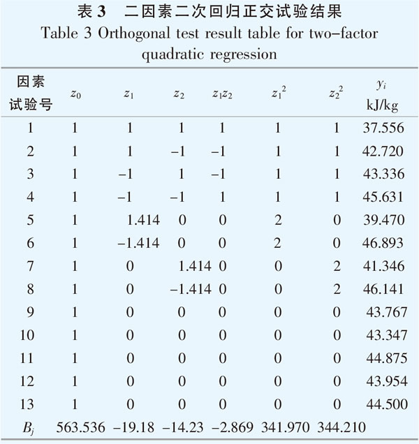 表3中,z0,z1,z2為單因素水平,z1z2,z12,z22為兩因素交互作用水平,yi為響應(yīng)變量。 2.3.3回歸系數(shù)計(jì)算