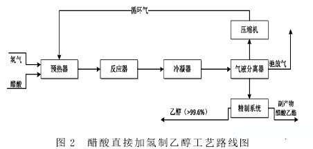 以生物質(zhì)制乙醇,以玉米為主要原料,噸乙醇消耗玉米3.2噸,蒸汽消耗4.96噸,電耗489.3kW·h。以目前玉米價(jià)格1760元/噸計(jì),玉米制乙醇物耗成本約6620元/噸。 以干木薯為主要原料,噸乙醇消耗木薯2.9噸,蒸汽消耗4.5噸,電耗417.1kW·h。以目前干木薯價(jià)格1850元/噸計(jì),木薯制乙醇物耗成本約6248元/噸。以秸稈等纖維素為主要原料,噸乙醇消耗約7.0噸,蒸汽消耗6.6噸,電耗581.5kW·h。以目前秸稈價(jià)格650元/噸計(jì),纖維素制乙醇物耗成本約5830元/噸。 3.2煤制乙醇技術(shù) 目前已建成中試裝置或已工業(yè)化煤制乙醇技術(shù)路線有四條: ?。?)合成氣微生物發(fā)酵法; ?。?)醋酸直接加氫法; ?。?)醋酸酯化加氫法; ?。?)合成氣、甲醇經(jīng)二甲醚羰基化加氫制乙醇法。 3.2.1煤制合成氣微生物發(fā)酵法制乙醇 該工藝技術(shù)原理為煤制合成氣中的有效氣體CO、H2通過(guò)微生物發(fā)酵轉(zhuǎn)化為乙醇混合溶液,首先通過(guò)膜分離將乙醇混合溶液中微生物分離回收利用,乙醇混合溶液再經(jīng)分離濃縮得到無(wú)水乙醇。 該技術(shù)國(guó)內(nèi)示范裝置為上海寶鋼與新西蘭朗澤新能源有限公司合建乙醇示范工廠,該工廠乙醇產(chǎn)能300噸/年,于2012年3月正式投入運(yùn)行,基本實(shí)現(xiàn)一系列關(guān)鍵指標(biāo)。該微生物氣體發(fā)酵制乙醇技術(shù)通過(guò)了國(guó)家發(fā)改委專(zhuān)家組的技術(shù)評(píng)審。該技術(shù)存在以下不足: ?。?)發(fā)酵液的乙醇濃度較低,乙醇的提純過(guò)程將消耗能量高; ?。?)因發(fā)酵需要有周期性,導(dǎo)致難連續(xù)化生產(chǎn); ?。?)受生物技術(shù)限制選擇性低,乙醇溶液中雜質(zhì)多分離困難,產(chǎn)品成本高。 3.2.2醋酸直接加氫技術(shù) 該工藝技術(shù)以塞拉尼斯(TCX技術(shù))為代表,上海景浦化工建有中試裝置,塞拉尼斯在南京已有規(guī)模20萬(wàn)噸/年裝置。 工藝路線如圖2。